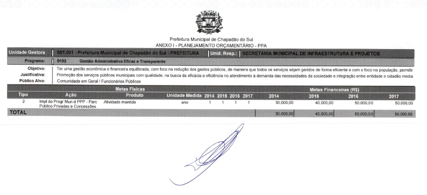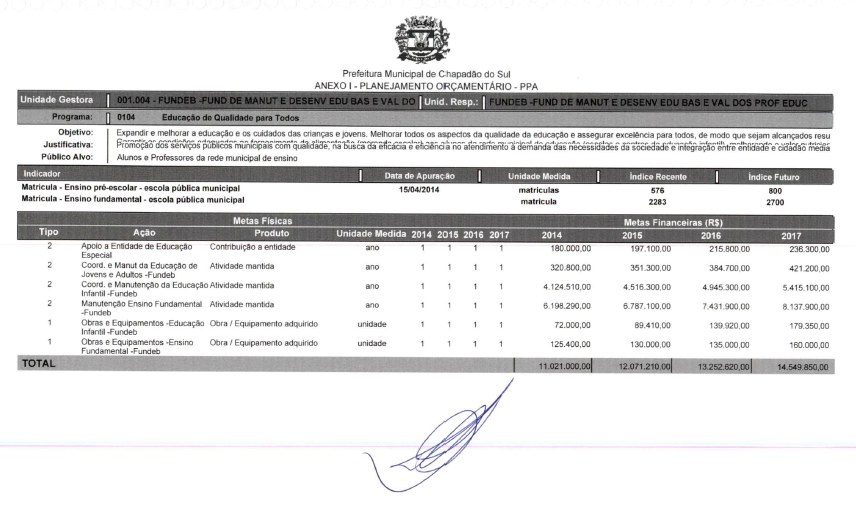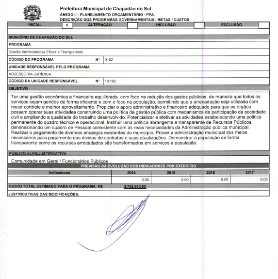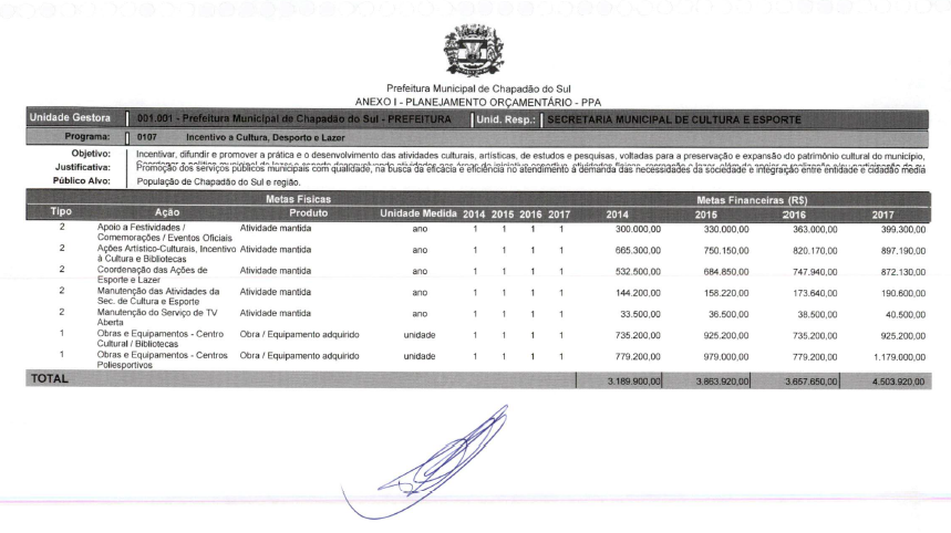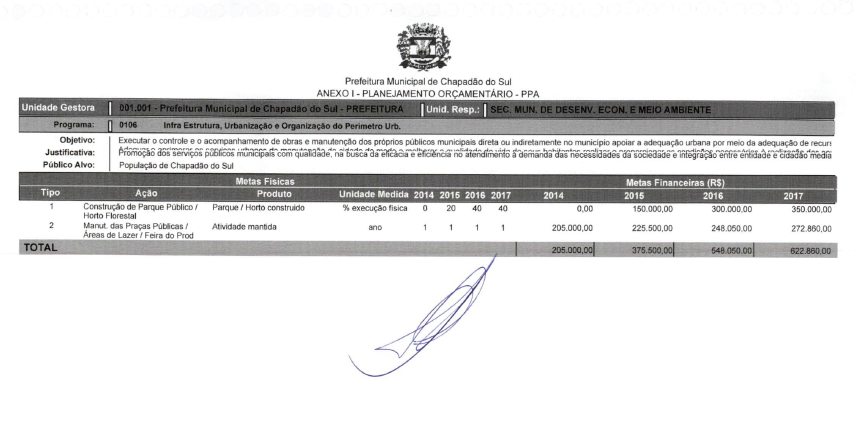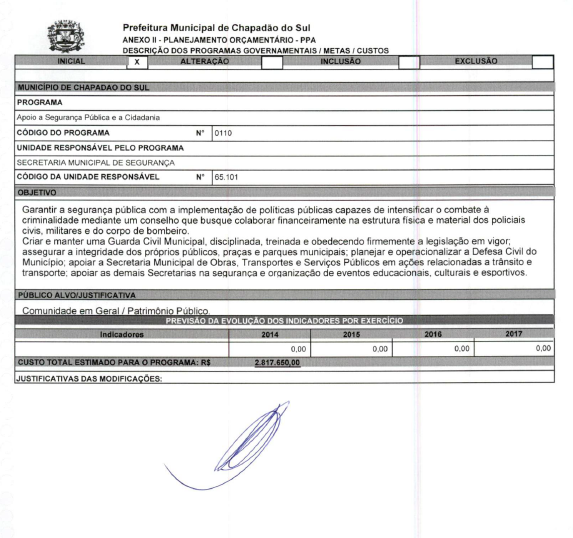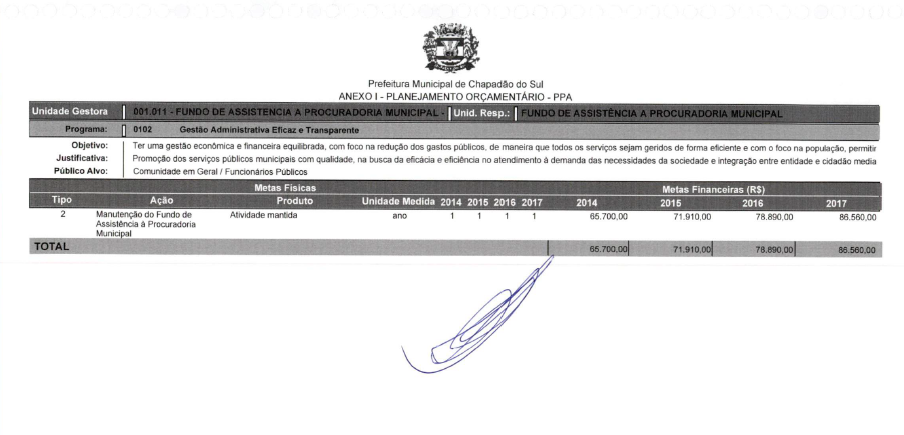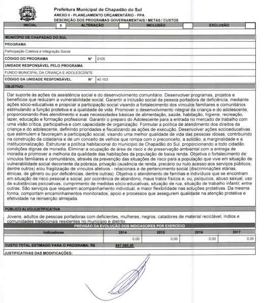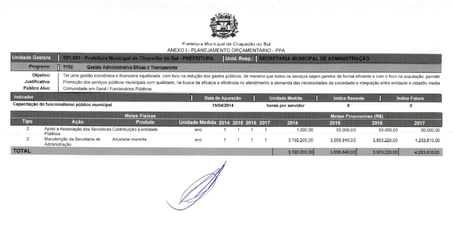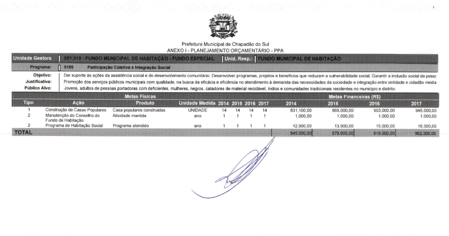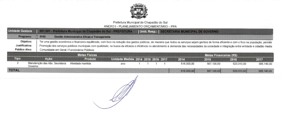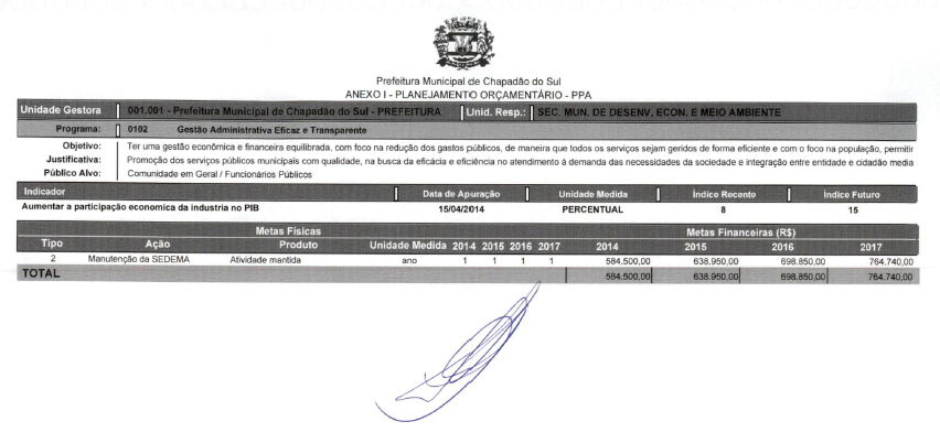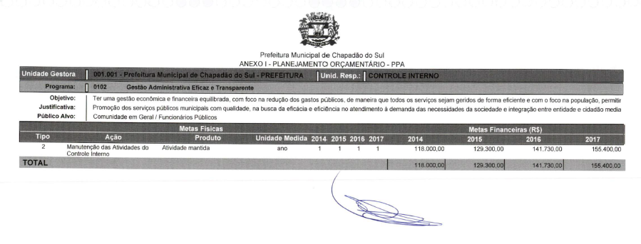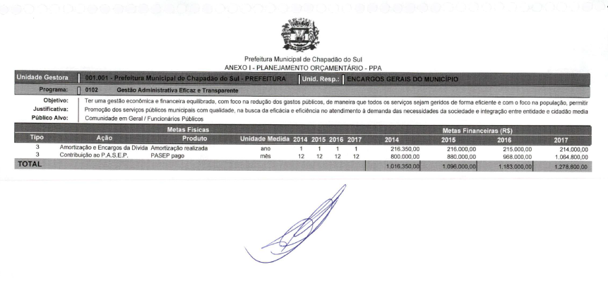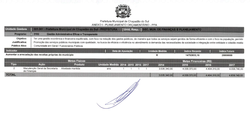 Esta lei e seus respectivos anexos institui o Plano Plurianual para o quadriênio 2014/2017, em cumprimento ao disposto no art. 165, parágrafo 1°, da Constituição Federal, estabelecendo para o período, os programas com seus respectivos objetivos, indicadores e montantes de recursos a serem aplicados em despesas de capital e outras delas decorrentes e nas despesas de duração continuada.