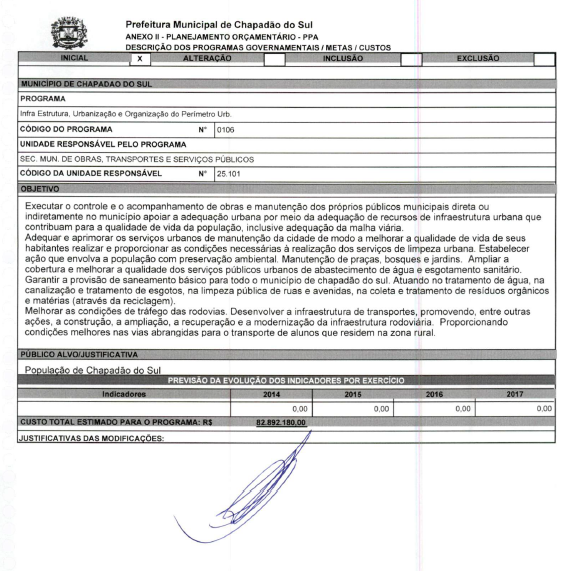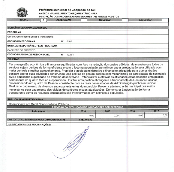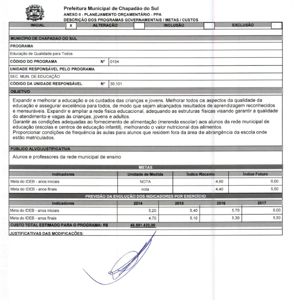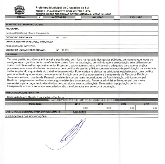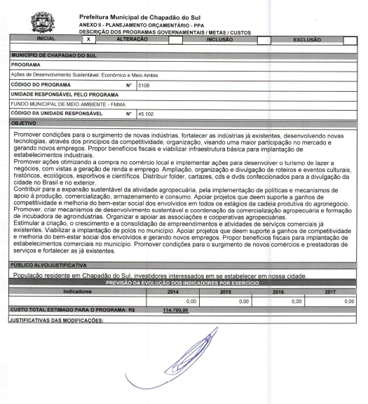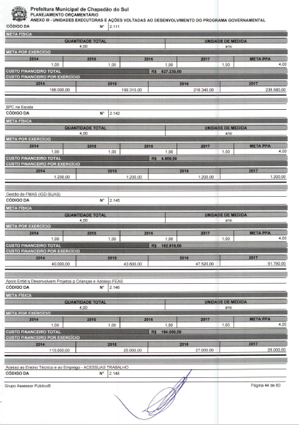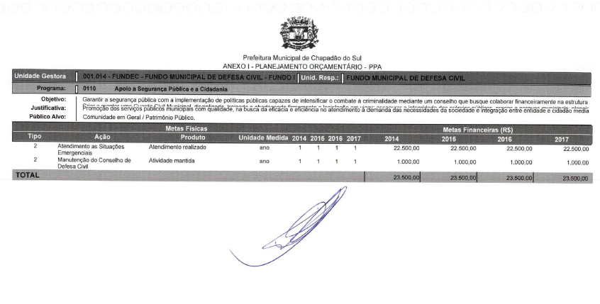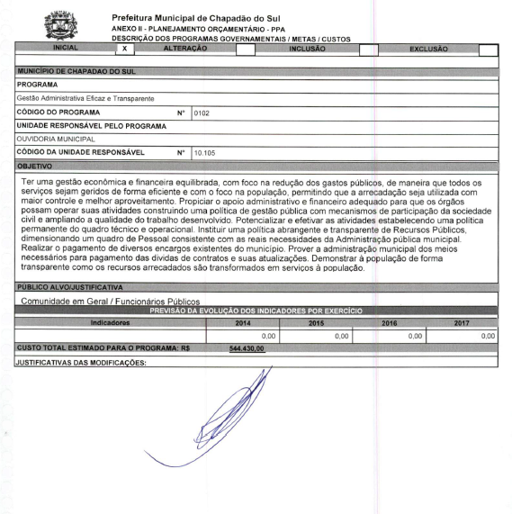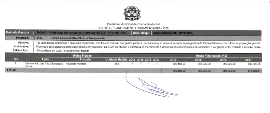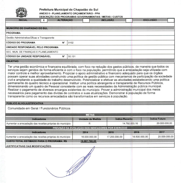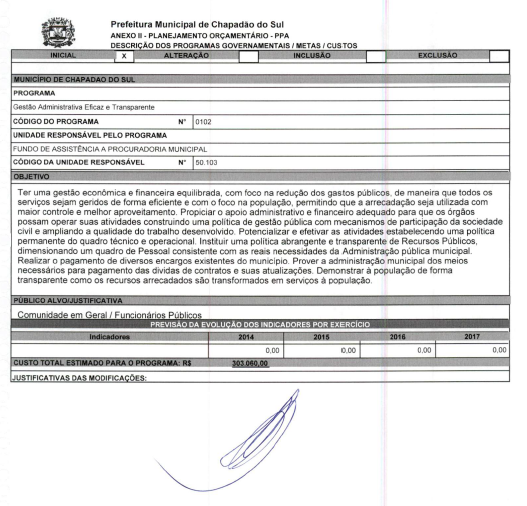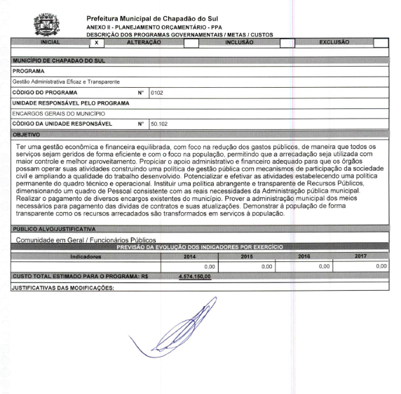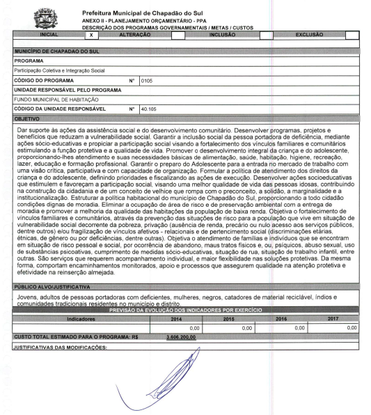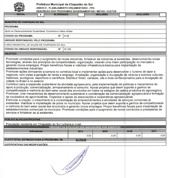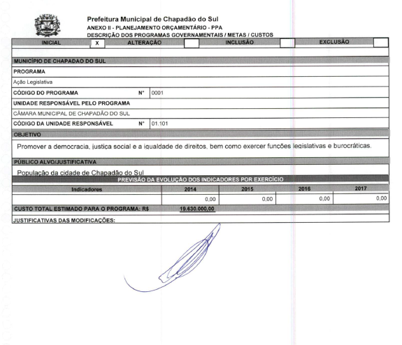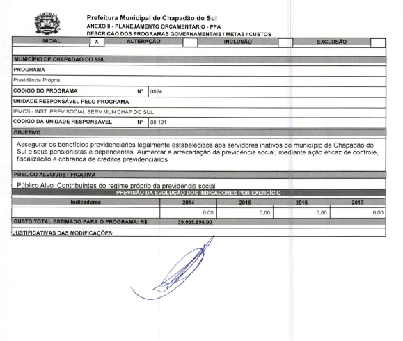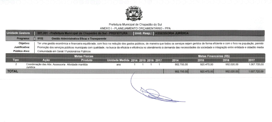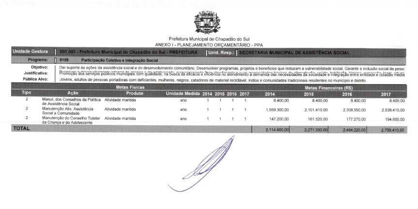 Esta lei e seus respectivos anexos institui o Plano Plurianual para o quadriênio 2014/2017, em cumprimento ao disposto no art. 165, parágrafo 1°, da Constituição Federal, estabelecendo para o período, os programas com seus respectivos objetivos, indicadores e montantes de recursos a serem aplicados em despesas de capital e outras delas decorrentes e nas despesas de duração continuada.