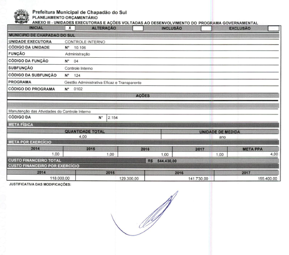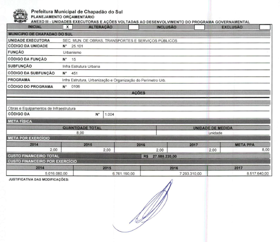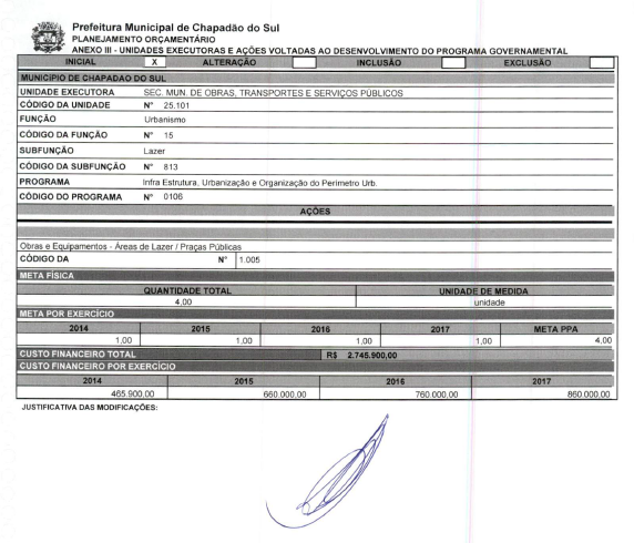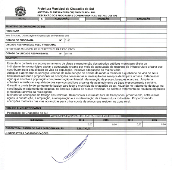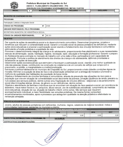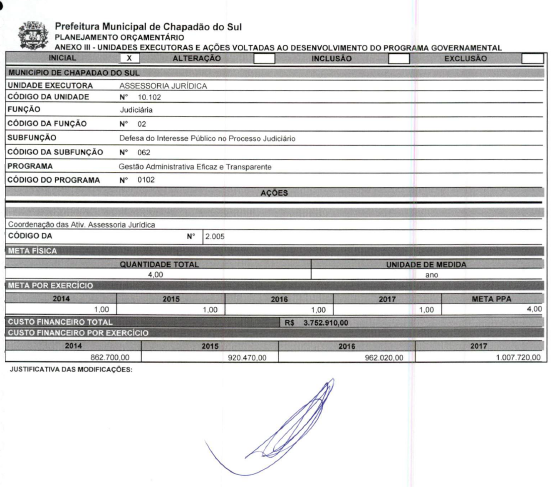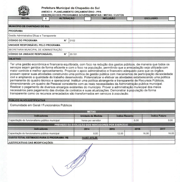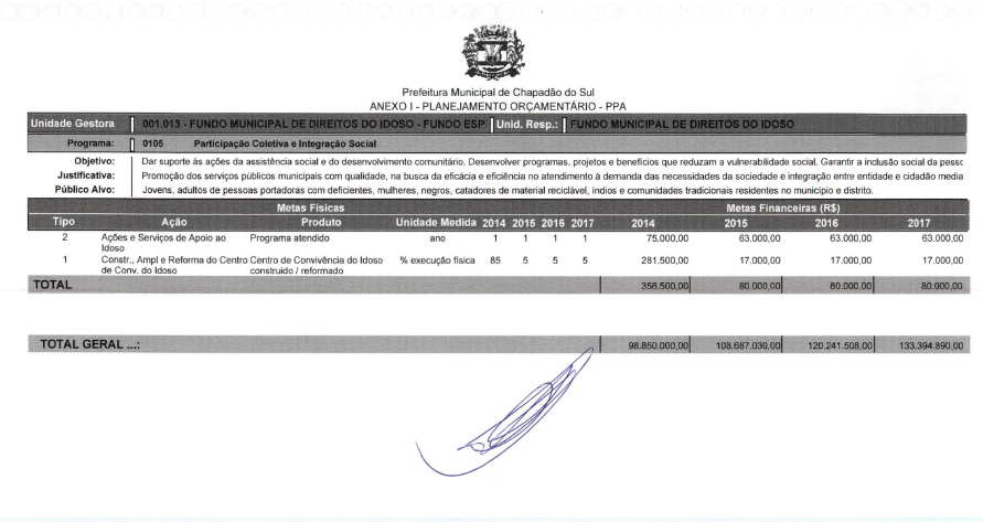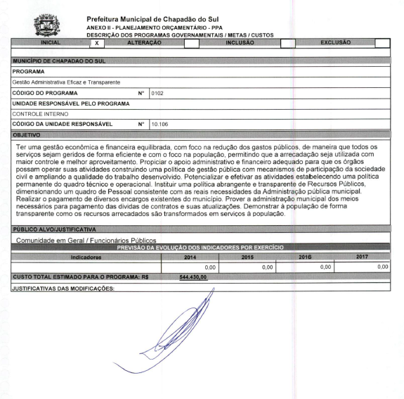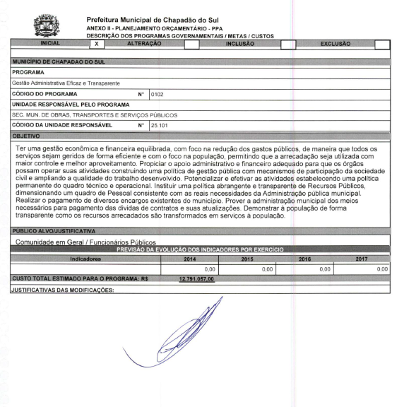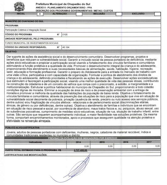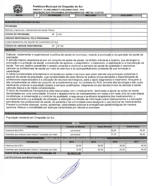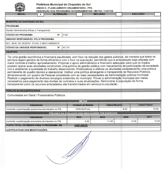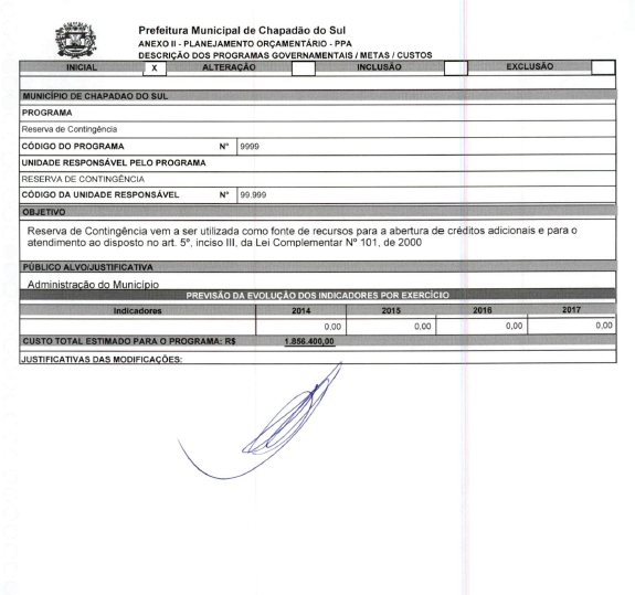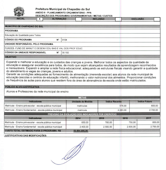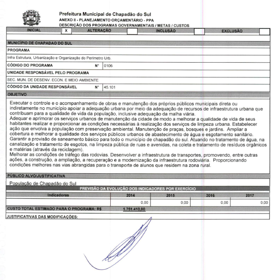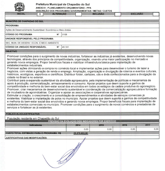 Esta lei e seus respectivos anexos institui o Plano Plurianual para o quadriênio 2014/2017, em cumprimento ao disposto no art. 165, parágrafo 1°, da Constituição Federal, estabelecendo para o período, os programas com seus respectivos objetivos, indicadores e montantes de recursos a serem aplicados em despesas de capital e outras delas decorrentes e nas despesas de duração continuada.