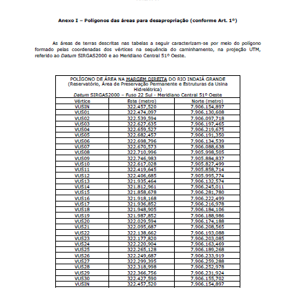 Ficam declaradas de utilidade pública, para fins de desapropriação, em favor da empresa Nova Indaiá Energia Ltda, inscrita no CNPJ 28.515.300/0001-22, nos termos da letra “f” do artigo 5º do Decreto Lei 3.365/41, as áreas de terras destinadas ao funcionamento da Central Geradora Hidrelétrica de Capacidade Reduzida CGH Indaiá, delimitadas pelos polígonos descritos no Anexo I deste Decreto.