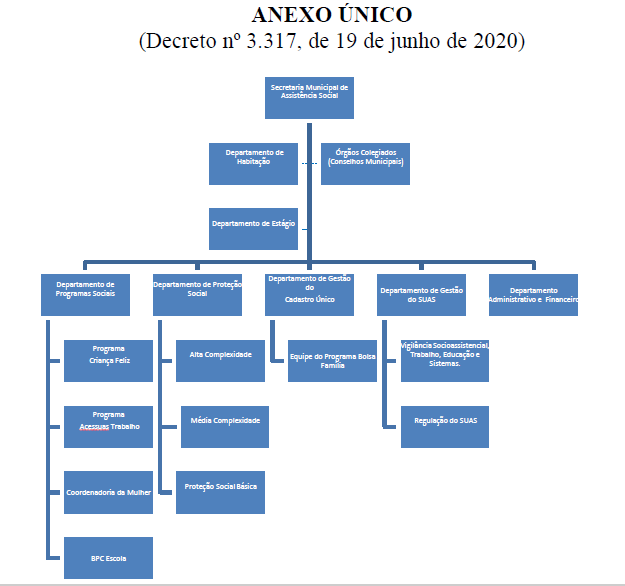 Fica a aprovado o Regimento Interno e Organograma da Secretaria Municipal de Assistência Social, conforme disposto nos artigos do presente Decreto.