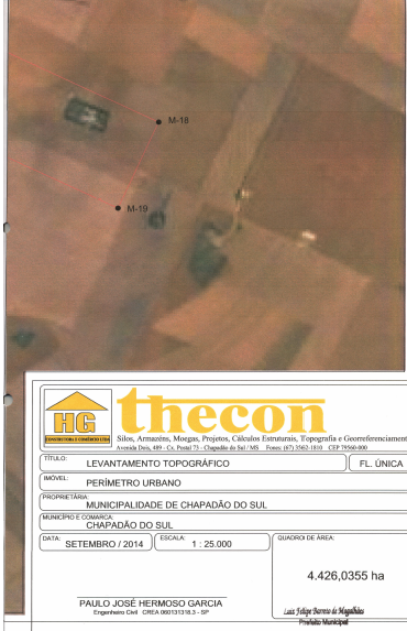 O Perímetro Urbano do Município de Chapadão do Sul/MS fica assim descrito: "Indica-se a descrição deste perímetro no vértice denominado 'M-01', georreferenciado no Sistema Geodésico Brasileiro, DATUM - SIRGAS, MC-51°W, coordenadas geodésicas: 18°44'55,38079" S e Longitude 52°43'16,08596" W; deste, segue com o azimute de 114°37'39" e 6.416,14 m até o vértice 'M-02', de coordenadas geodésicas Latitude 18°46'24,13975" S e Longitude 52°39'57,82728" W; deste, segue com o azimute de 7°21'21" e 1.271,97 m até o vértice 'M-03', de coordenadas geodésicas Latitude 18°45'43,16195" S e Longitude 52°39'51,86435" W; deste, segue com o azimute de 114°47'44" e 2.486,27 m até o vértice 'M-04', de coordenadas geodésicas Latitude 18°46'17,75526" S e Longitude 52°38'35,13282" W; deste, segue com o azimute de 23°24'24" e 762,43 m até o vértice 'M-05', de coordenadas geodésicas Latitude 18°45'55,09014" S e Longitude 52°38'24,57130" W; deste, segue com o azimute de 113°24'15" e 389,99 m até o vértice 'M-06', de coordenadas geodésicas Latitude 18°46'00,23537" S e Longitude 52°38'12,40025" W; deste, segue com o azimute de 106°40'36" e 1.371,84 m até o vértice 'M-07', de coordenadas geodésicas Latitude 18°46'13,43051" S e Longitude 52°37'27,65401" W; deste, segue com o azimute de 78°15'09" e 2.113,81 m até o vértice 'M-08', de coordenadas geodésicas Latitude 18°46'00,04375" S e Longitude 52°36'16,85918" W; deste, segue com o azimute de 177°40'23" e 466,11 m até o vértice 'M-09', de coordenadas geodésicas Latitude 18°46'15,19628" S e Longitude 52°36'16,35630" W; deste, segue com o azimute de 78°09'03" e 2.432,71 m até o vértice 'M-10', de coordenadas geodésicas Latitude 18°45'59,64270" S e Longitude 52°34'54,91081" W; deste, segue com o azimute de 204°57'28" e 961,23 m até o vértice 'M-11', de coordenadas geodésicas Latitude 18°46'27,86903" S e Longitude 52°35'09,02439" W; deste, segue com o azimute de 112°55'37" e 1.161,50 m até o vértice 'M-12', de coordenadas geodésicas Latitude 18°46'42,89425" S e Longitude 52°34'32,63433" W; deste, segue com o azimute de 268°44'24" e 630,27 m até o vértice 'M-13', de coordenadas geodésicas Latitude 18°4.51" S e Longitude 52°34'41.61" W; deste, segue com o azimute de 268°45'00" e 980,88 m até o vértice 'M-14', de coordenadas geodésicas Latitude 18°46'47.74" S e Longitude 52°35'11.83 W; deste, segue com o azimute de 270°12'00" e 1.370,74 m até o vértice 'M-15', de coordenadas geodésicas Latitude 18°47'28.27" S e Longitude 52°35'31,37" W; deste, segue com o azimute de 271°12'00" e 312,08 m até o vértice 'M-16', de coordenadas geodésicas Latitude 18°47'32,82" S e Longitude 52°35'21,85" W; deste segue com o azimute de 205°05'31" e 979,96 m até o vértice 'M-17', de coordenadas geodésicas Latitude 18°48'01,48261" S e Longitude 52°35'36,33267" W; deste, segue com o azimute de 114°47'17" e 2.441,31 m até o vértice 'M-18', de coordenadas geodésicas Latitude 18°48'35,41446" S e Longitude 52°34'20,95111" W; deste, segue com o azimute de 205°05'31" e 1102,65 m até o vértice 'M-19', de coordenadas geodésicas Latitude 18°49'07,67296" S e Longitude 52°34'37,18212" W; deste, segue com o azimute de 294°47'09" e 2.965,67 m até o vértice 'M-20', de coordenadas geodésicas Latitude 18°48'26,45257" S e Longitude 52°36'08,75847" W; deste, segue com o azimute de 159°36'17" e 2.005,95 m até o vértice 'M-21', de coordenadas geodésicas Latitude 18°49'27,80812" S e Longitude 52°35'45,46127" W; deste, segue com o azimute de 293°59'18" e 2.718,36 m até o vértice 'M-22', de coordenadas geodésicas Latitude 18°48'51,13362" S e Longitude 52°37'09,94353" W; deste, segue com o azimute de 191°21'25" e 460,82 m até o vértice 'M-23', de coordenadas geodésicas Latitude 18°49'05,80064" S e Longitude 52°37'13,18354" W; deste, segue com o azimute de 294°32'29" e 1.001,93 m até o vértice 'M-24', de coordenadas geodésicas Latitude 18°48'51,99489" S e Longitude 52°37'44,18146" W; deste, segue com o azimute de 191°21'05" e 699,49 m até o vértice 'M-25', de coordenadas geodésicas Latitude 18°49'14,25845" S e Longitude 52°37'49,09853" W; deste, segue com o azimute de 299°01'46" e 3.818,40 m até o vértice 'M-26', de coordenadas geodésicas Latitude 18°48'12,99013" S e Longitude 52°39'42,53497" W; deste, segue com o azimute de 35°14'36" e 2.341,08 m até o vértice 'M-27', de coordenadas geodésicas Latitude 18°47'11,21649" S e Longitude 52°38'55,79539" W; deste, segue com o azimute de 294°35'03" em 6.544,37 m até o vértice 'M-28', de coordenadas geodésicas Latitude 18°45'40,84537" S e Longitude 52°42'18,11333" W; deste, segue com o azimute de 233°40'26" em 389,38 m até o vértice 'M-29', de coordenadas geodésicas Latitude 18°45'48,24922" S e Longitude 52°42'28,89910" W; deste, segue com o azimute de 322°21'25" em 730,24 m até o vértice 'M-30', de coordenadas geodésicas Latitude 18°45'29,30495" S e Longitude 52°42'43,93573" W; deste, segue com o azimute de 317°22'18" e 1.405,28 m até o vértice 'M-01', de coordenadas geodésicas Latitude 18°44'55,38079" S e Longitude 52°43'16,08596" W; início de descrição, fechando assim o perímetro do polígono acima descrito com perímetro total de 52.729,17 m e com área total intra-perimetral de 4.426,0355 há".