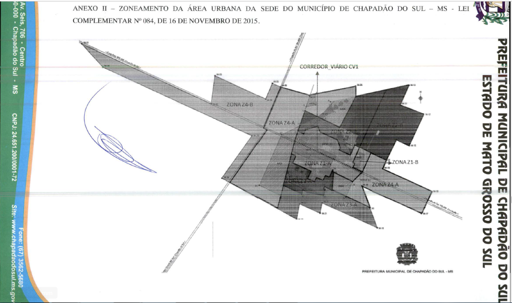 "ZONA Z1-B: O Perímetro da ZONA Z1-B fica assim descrito: Inicia-se no ponto 33, definido pela coordenada geográfica de Latitude 18°47'26.1 1" Sul e Longitude 52°36'18.66" Oeste, seguindo uma distância de 820,74m orientação SE, até chegar ao ponto 32, definido pela coordenada geográfica de Latitude 18°47'37.28" Sul e Longitude 52°35'54.96" Oeste, seguindo uma distância de 733,52m com orientação NE, até chegar ao ponto 27, definido pela coordenada geográfica de Latitude 18°48'5.98" Sul e Longitude 52°36'8.90" Oeste, seguindo uma distância de 438, 11 m com orientação NO margeando a MS - 306, até o cruzamento com a Travessa Teldo Kasper, seguindo uma distância de 189,62m na Travessa Teldo Kasper sentido NE, até o cruzamento com a Rua Laureno Schettert Machado, seguindo uma distância de 102,26m na Rua Laureno Schettert Machado, até o cruzamento com a Av. Das Indústrias, seguindo uma distância de 356,23m na Av. Das Indústrias, até o cruzamento com a Av. São Paulo, seguindo uma distância de 26,38m na Av. São Paulo, da Av. São Paulo seguindo uma distância de 503,54m orientação NE até chegar ao ponto 33, ponto inicial da descrição deste perímetro fechando assim o polígono, abarcando ainda o Bairro Empresarial Tropical ."